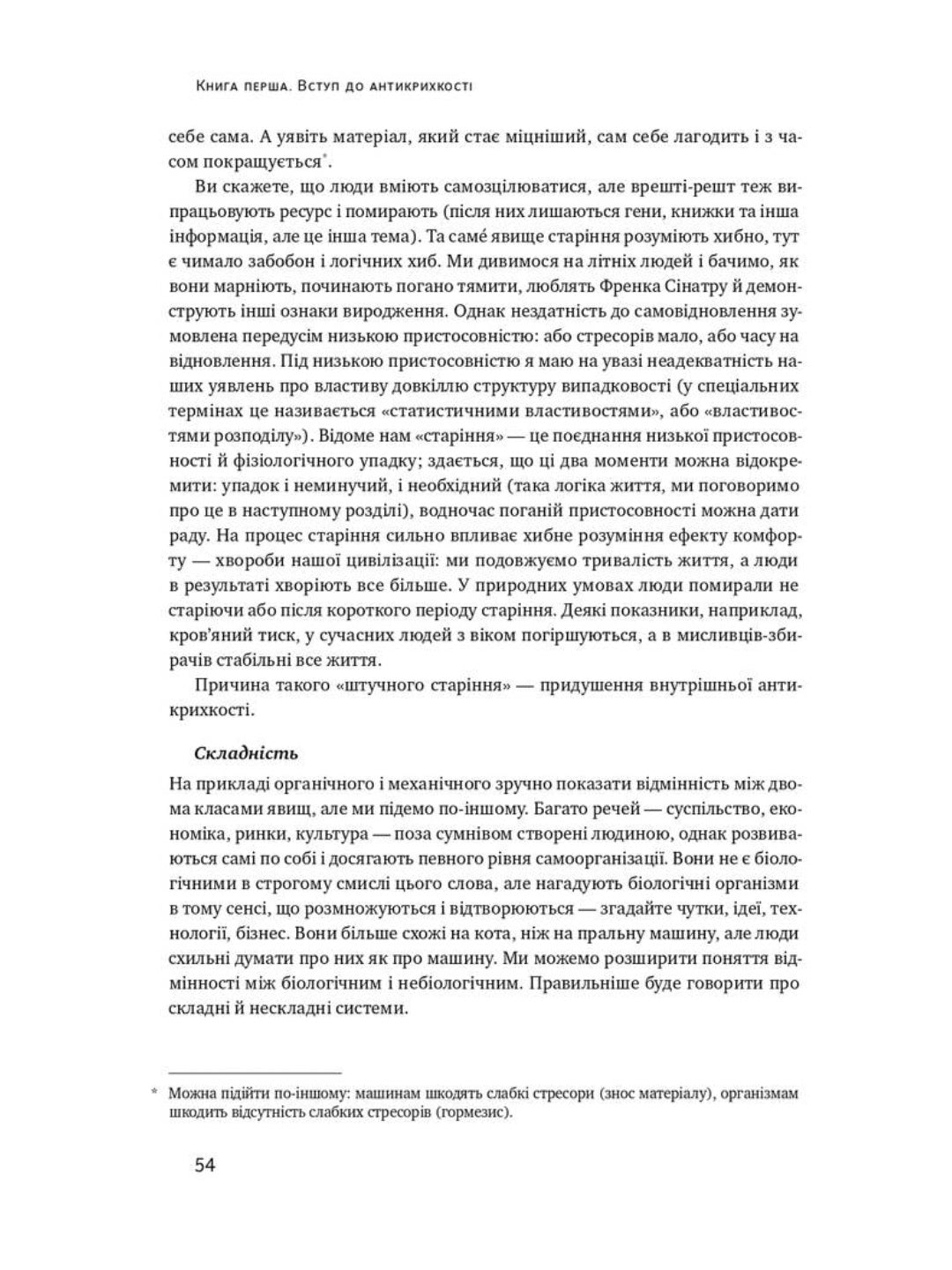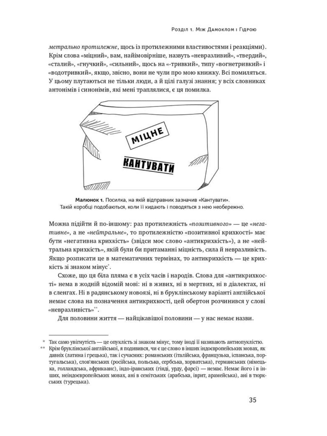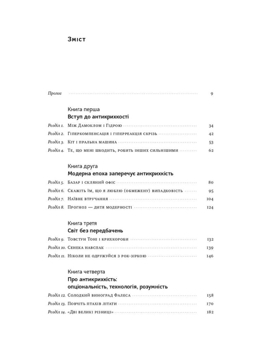 Наше життя неможливе без хаосу, мінливості та стресу, які постійно тиснуть на нас. В умовах невизначеності ми прагнемо сталості, однак саме вона стає перешкодою на шляху до розвитку. Дивовижно, та завдяки невизначеності і впливу змін люди, речі та цілі системи можуть еволюціонувати й ставати кращими. Цю рису Насім Талеб називає антикрихкістю й окреслює прості правила, які допоможуть обернути непередбачуваність і невизначеність на джерело самовдосконалення. Ба більше, ця властивість дає користь як людям, так і компаніям і навіть країнам, а коло питань, які допомагає з’ясувати книжка, надзвичайно широке — від методу помилок, оцінювання ризику до політики, освіти й медицини.
