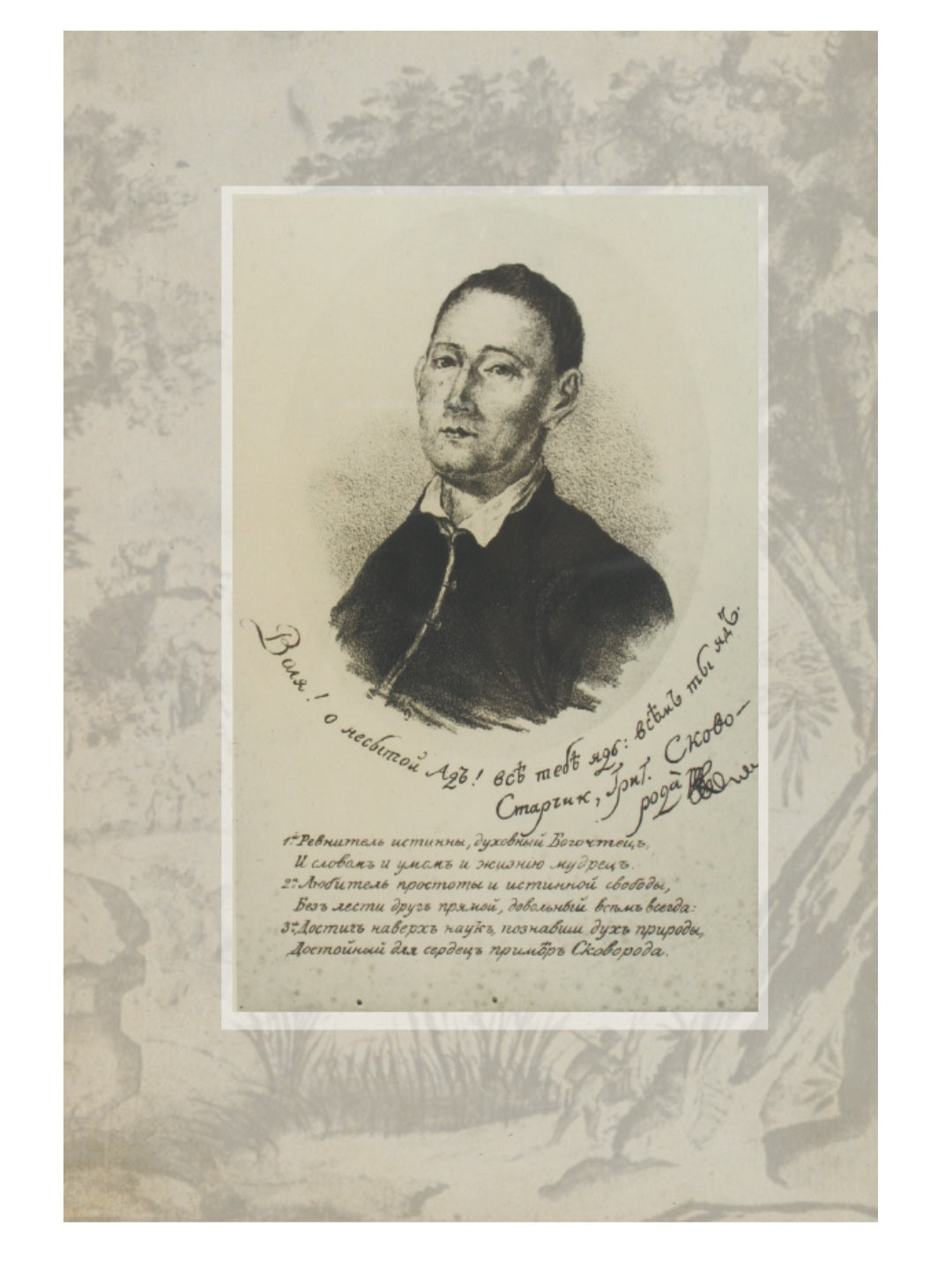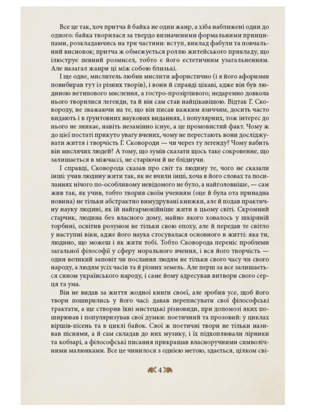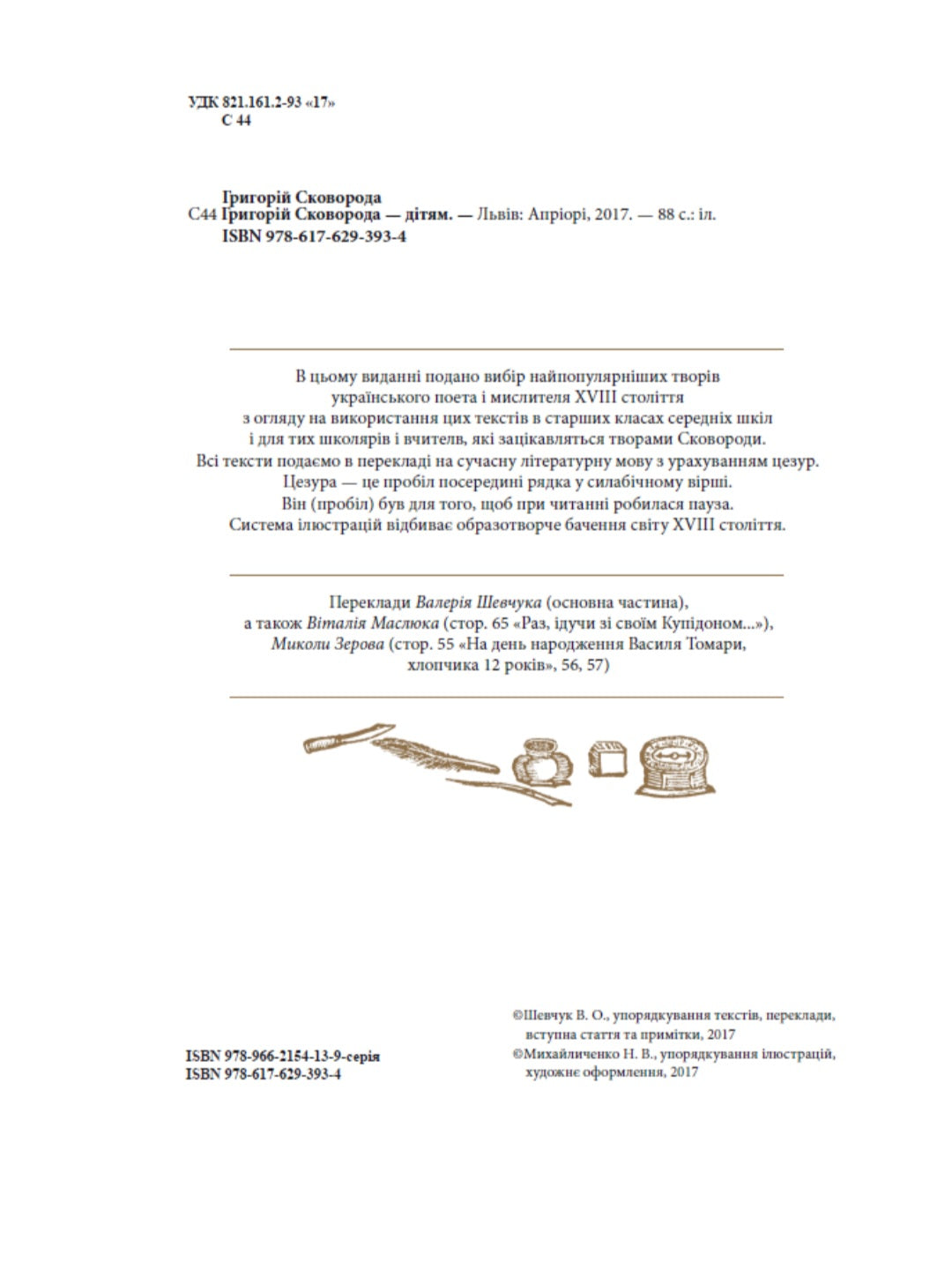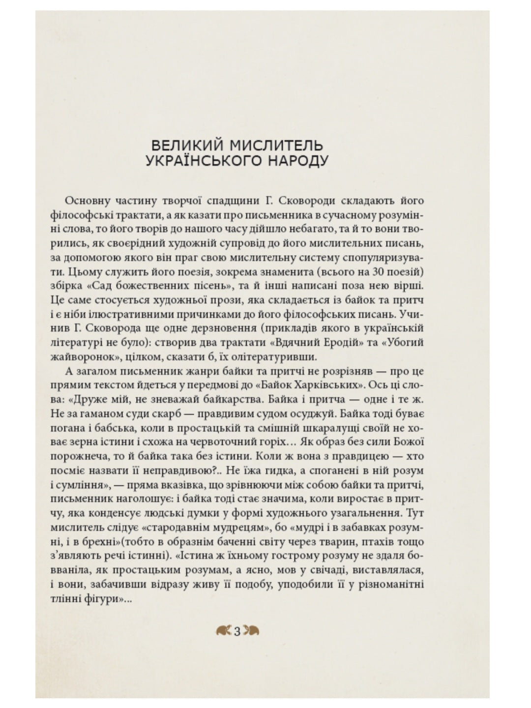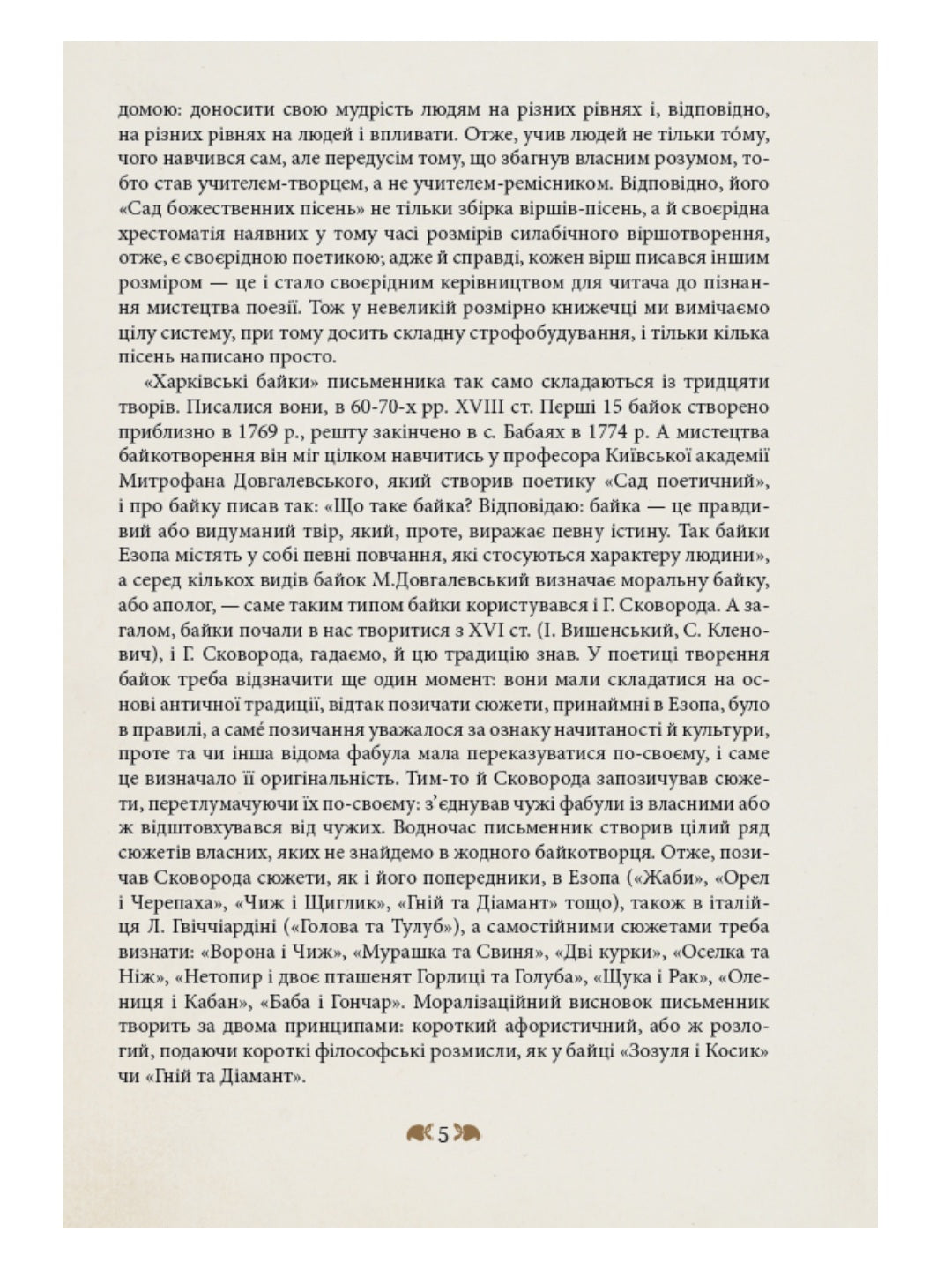 В цьому виданні подано вибір найпопулярніших творів українського поета і мислителя XVIII століття з огляду на використання цих текстів в старших класах середніх шкіл і для тих школярів і вчителв, які зацікавляться творами Сковороди. Всі тексти подаємо в перекладі на сучасну літературну мову з урахуванням цезур. Цезура — це пробіл посередині рядка у силабічному вірші. Він (пробіл) був для того, щоб при читанні робилася пауза. Система ілюстрацій відбиває образотворче бачення світу XVIII століття.