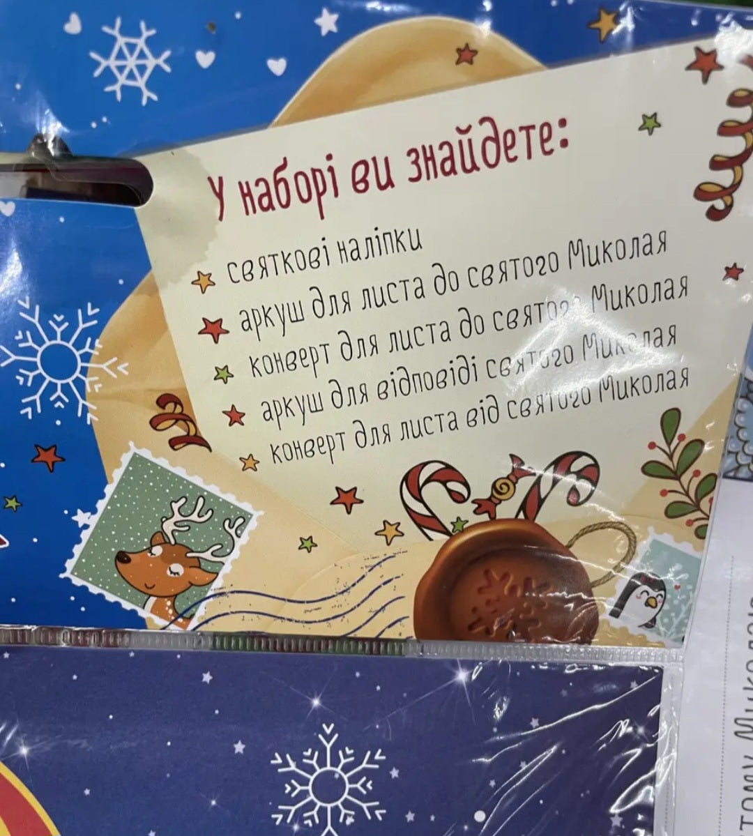 Але листи не повинні залишатися без відповіді, тому в наборі ви знайдете спеціальний аркуш та конверт від самого святого Миколая!Проявіть фантазію та креативність, подумайте про те, що ви хотіли б розповісти дитині, якими мудрими думками готові поділитися.Оформлену відповідь вручіть разом з іншими подарунками, приготовленими на честь Дня святого Миколая.