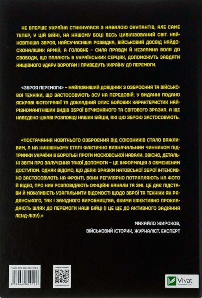 «Зброя перемоги» — найповніший довідник з озброєння та військової техніки, що застосовують ЗСУ на передовій. У виданні подано яскраві фотографії та докладний опис бойових характеристик найрізноманітніших видів зброї вітчизняного і світового зразка, а ще наведено цікаві розповіді наших бійців, які цю зброю застосовують.
