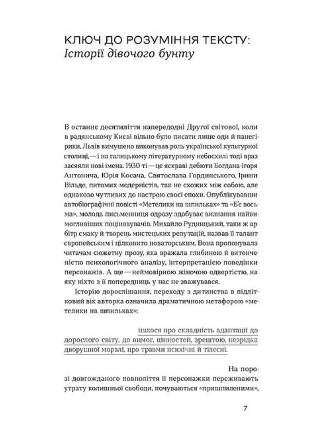 Трилогія Ірини Вільде — це тексти про складність адаптації дівчинки до дорослого світу, до вимог, цінностей і незрідка подвійної моралі початку ХХ століття. Навіть власний дім стає місцем психологічних травм та сексуального насилля. Вже там героїня Вільде почувається пришпиленим метеликом, барвистою, святково вбраною істотою, котрою милуються поціновувачі колекції. Тринадцятилітня дівчинка існує насамперед для того, щоб їм подобатися, розважати. Школа і суспільне життя тільки підсилюють відчуття задухи для дівчини.