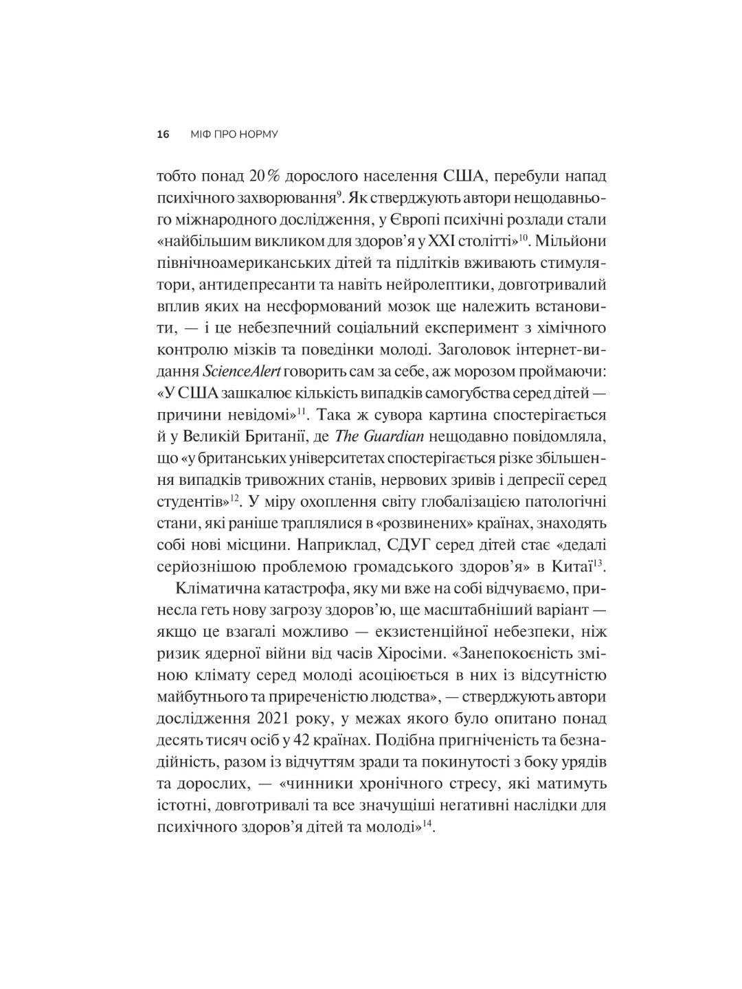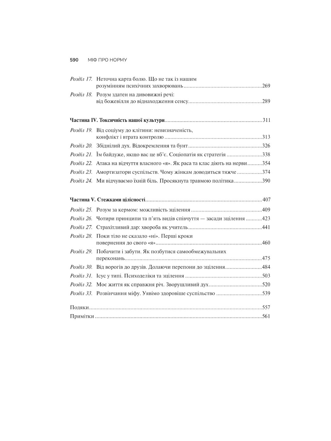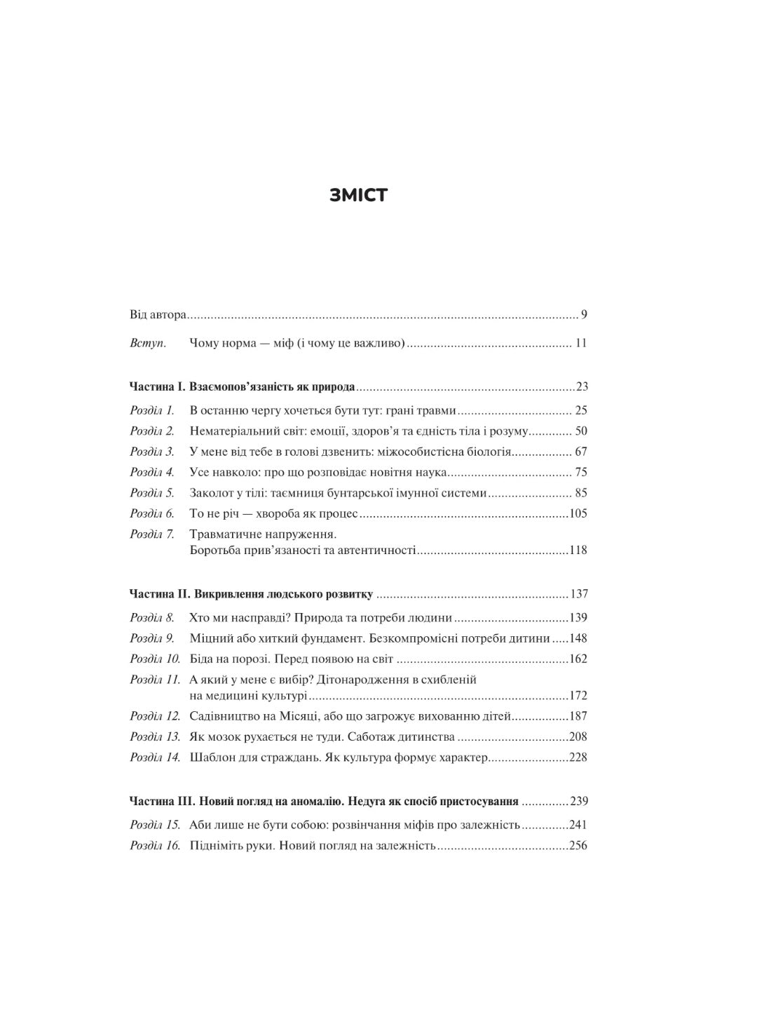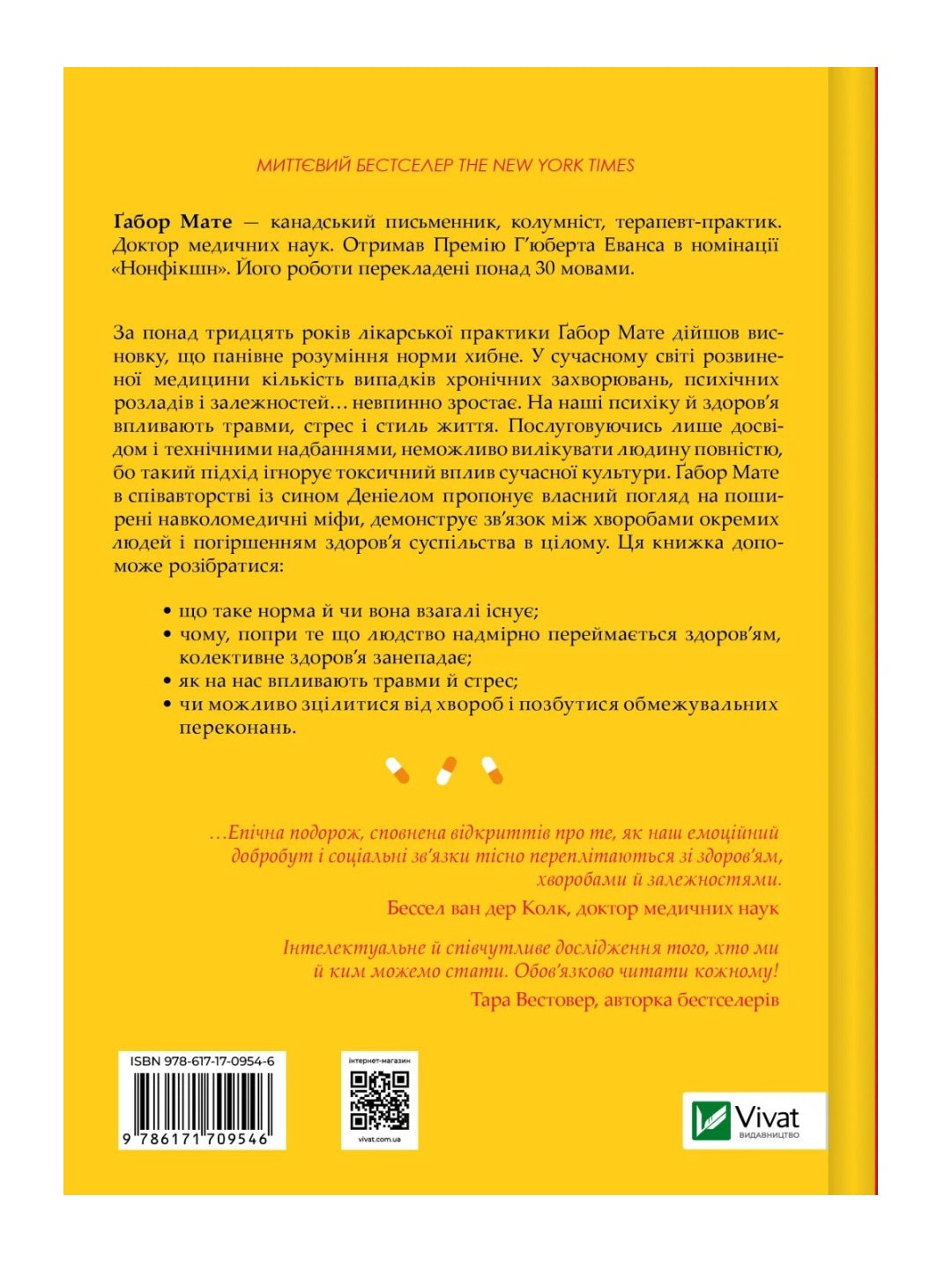 За понад тридцять років лікарської практики Ґабор Мате дійшов висновку, що панівне розуміння норми хибне. У сучасному світі розвиненої медицини кількість випадків хронічних захворювань, психічних розладів і залежностей… невпинно зростає. На наші психіку й здоров’я впливають травми, стрес і стиль життя. Послуговуючись лише досвідом і технічними надбаннями, неможливо вилікувати людину повністю, бо такий підхід ігнорує токсичний вплив сучасної культури. Ґабор Мате в співавторстві із сином Деніелом пропонує власний погляд на поширені навколомедичні міфи, демонструє зв’язок між хворобами окремих людей і погіршенням здоров’я суспільства в цілому. Ця книжка допоможе розібратися: