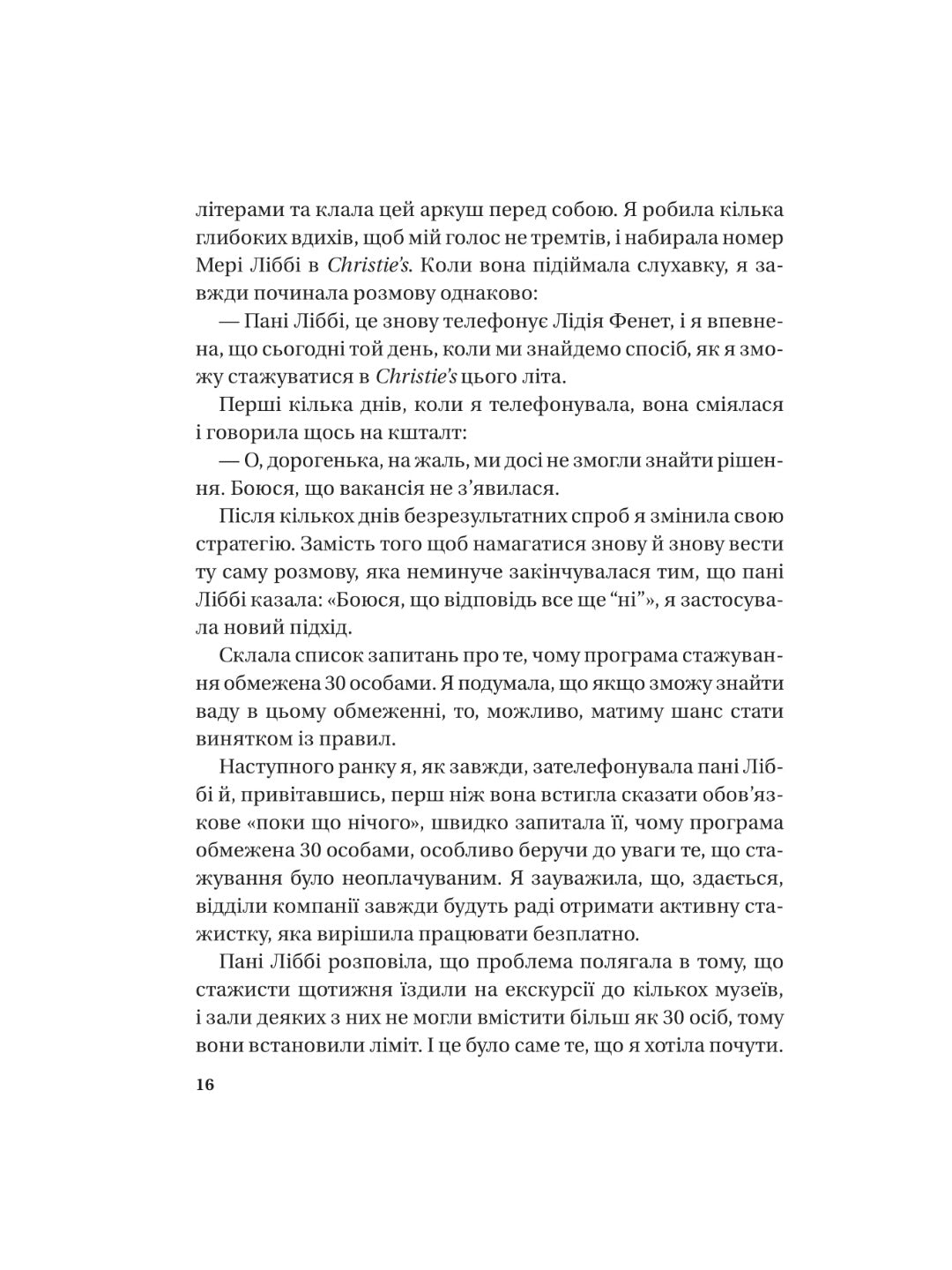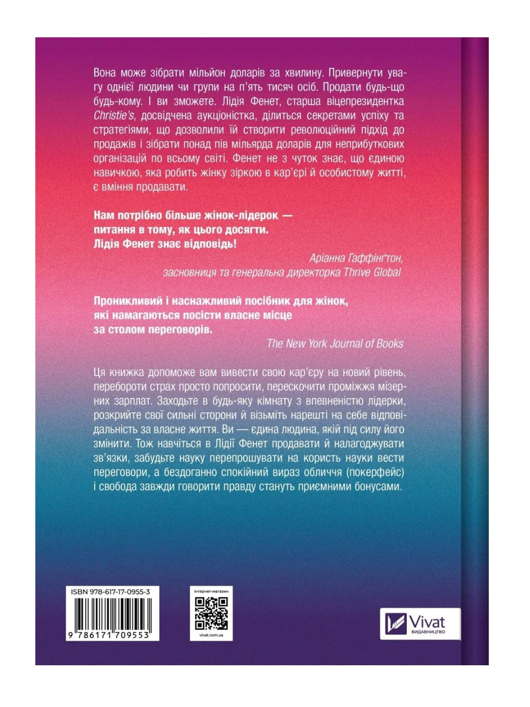 Вона може зібрати мільйон доларів за хвилину. Привернути увагу однієї людини чи групи на п’ять тисяч осіб. Продати будь-що будь-кому. І ви зможете. Лідія Фенет, старша віцепрезидентка Christie’s, досвідчена аукціоністка, ділиться секретами успіху та стратегіями, що дозволили їй створити революційний підхід до продажів і зібрати понад пів мільярда доларів для неприбуткових організацій по всьому світі. Фенет не з чуток знає, що єдиною навичкою, яка робить жінку зіркою в кар’єрі й особистому житті, є вміння продавати.