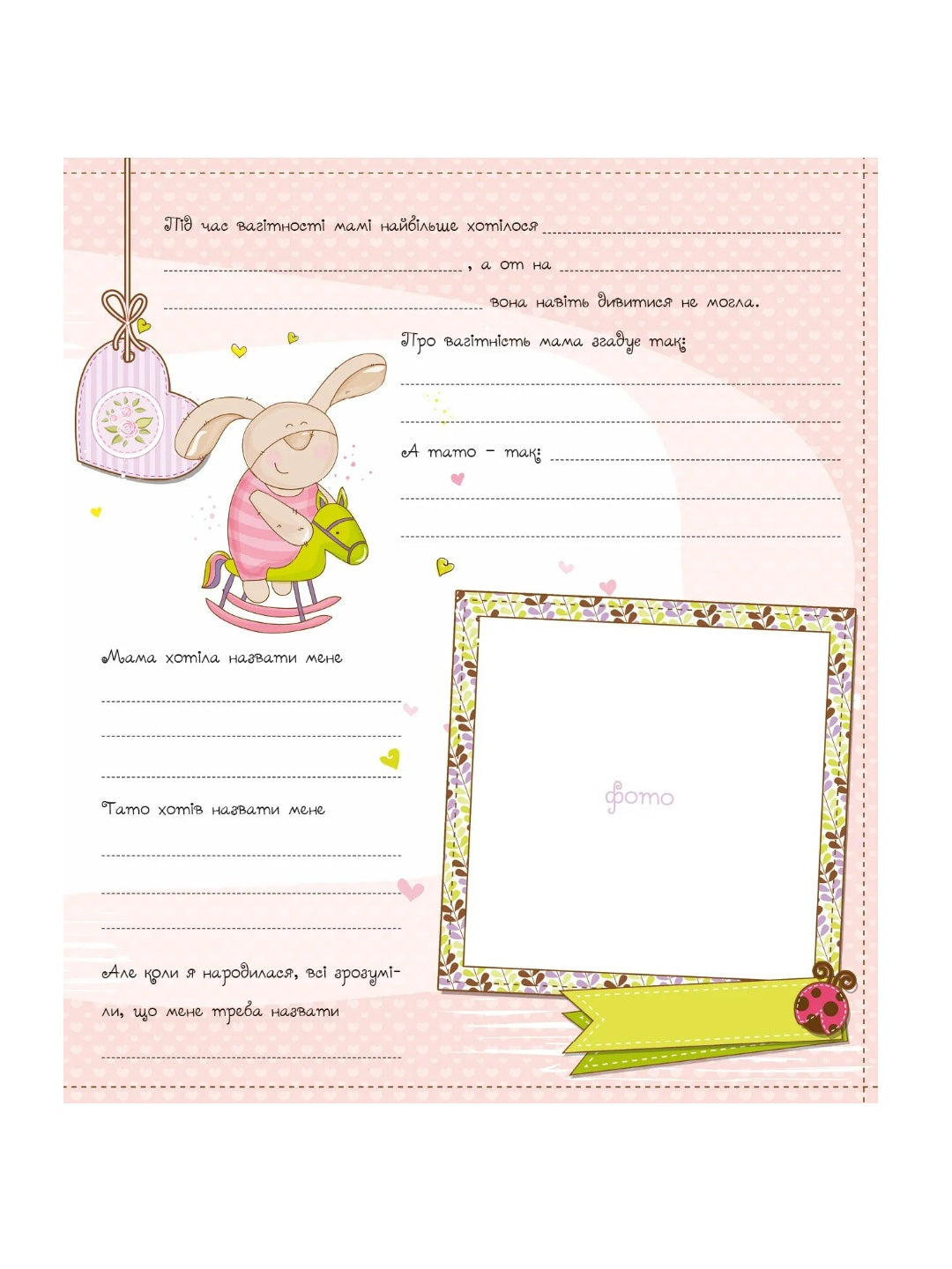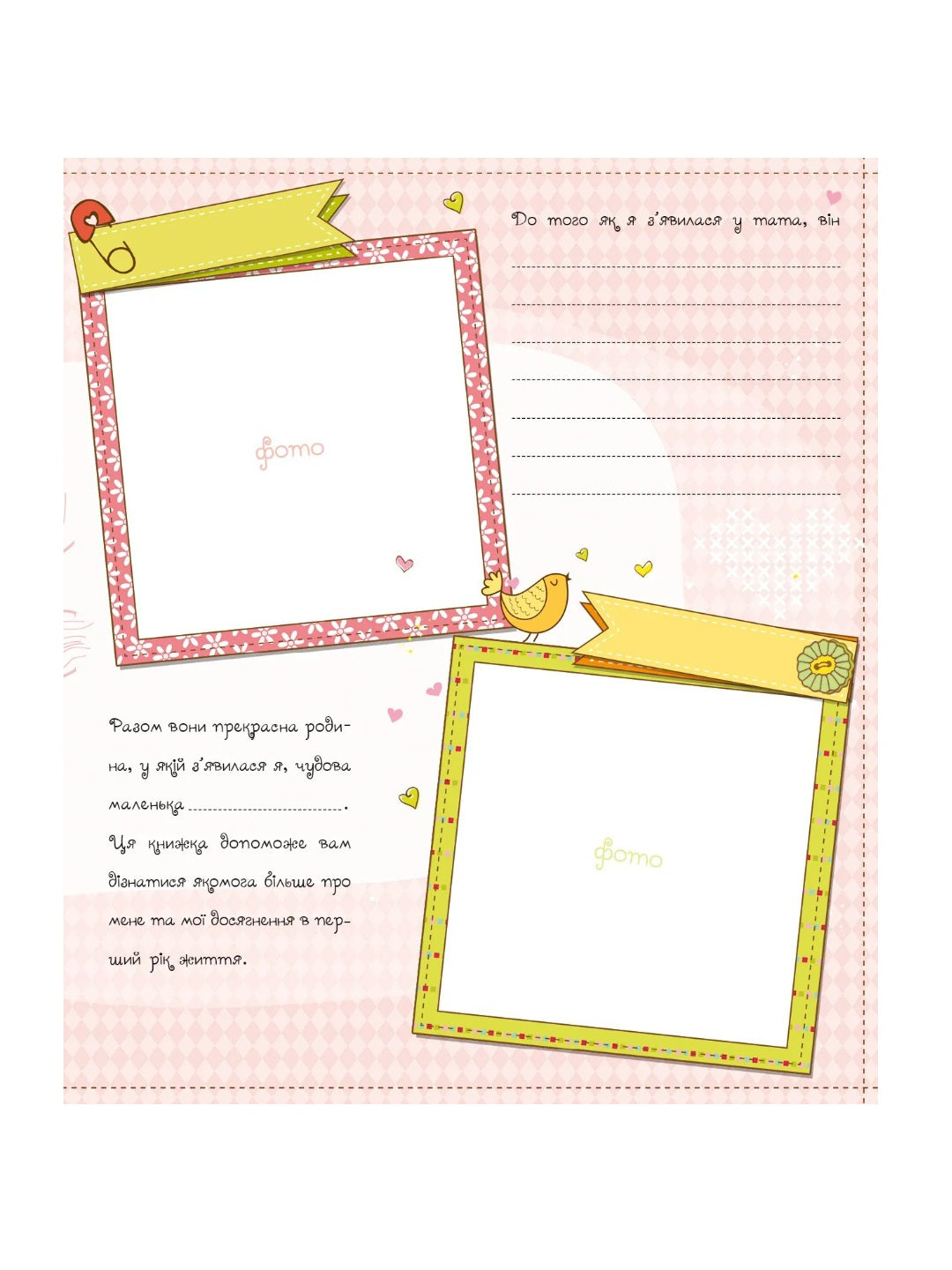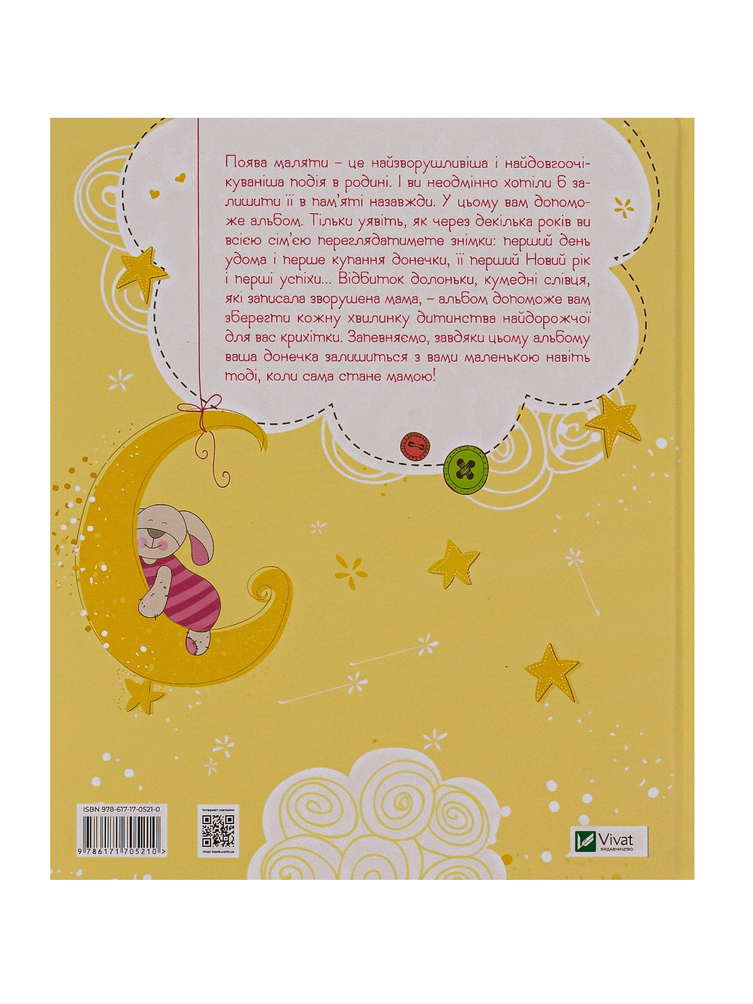 Поява маляти — це найзворушливіша і найдовгоочікуваніша подія в родині. Хіба ви не хотіли б залишити її у пам’яті назавжди? У цьому вам допоможе альбом. Тільки уявіть, як через декілька років ви всією сім’єю переглядатимете знімки — перший день вдома і перше купання донечки, її перший Новий рік і перші успіхи... Відбиток маленької долоньки, кумедні слівця — альбом допоможе вам зберегти кожну хвилинку дитинства найдорожчої для вас людини. Запевняємо, завдяки цьому альбому ваша крихітка залишиться з вами навіть тоді, коли сама стане мамою!