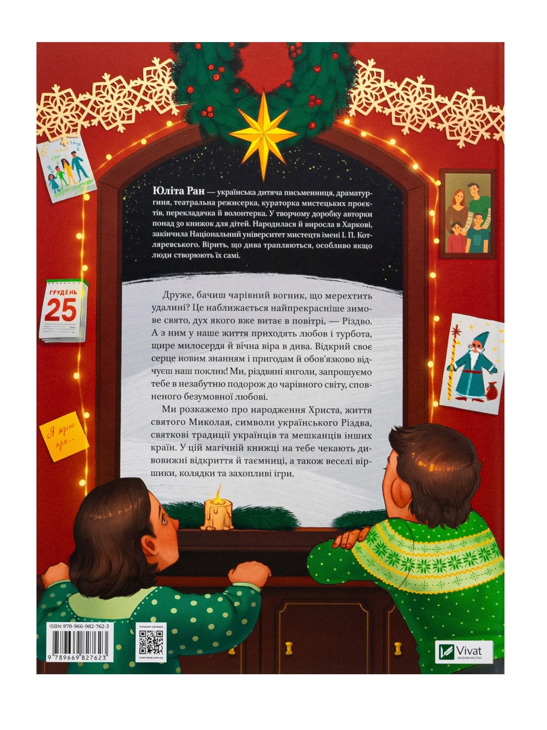 Друже, бачиш чарівний вогник, що мерехтить удалині? Це наближається найпрекрасніше зимо ве свято, дух якого вже витає в повітрі, — Різдво. А з ним у наше життя приходять любов і турбота, щире милосердя й вічна віра в дива. Відкрий своє серце новим знанням і пригодам й обов’язково від чуєш наш поклик! Ми, різдвяні янголи, запрошуємо тебе в незабутню подорож до чарівного світу, спов неного безумовної любові. Ми розкажемо про народження Христа, життя святого Миколая, символи українського Різдва, святкові традиції українців та мешканців інших країн. У цій магічній книжці на тебе чекають ди вовижні відкриття й таємниці, а також веселі вір шики, колядки та захопливі ігри.