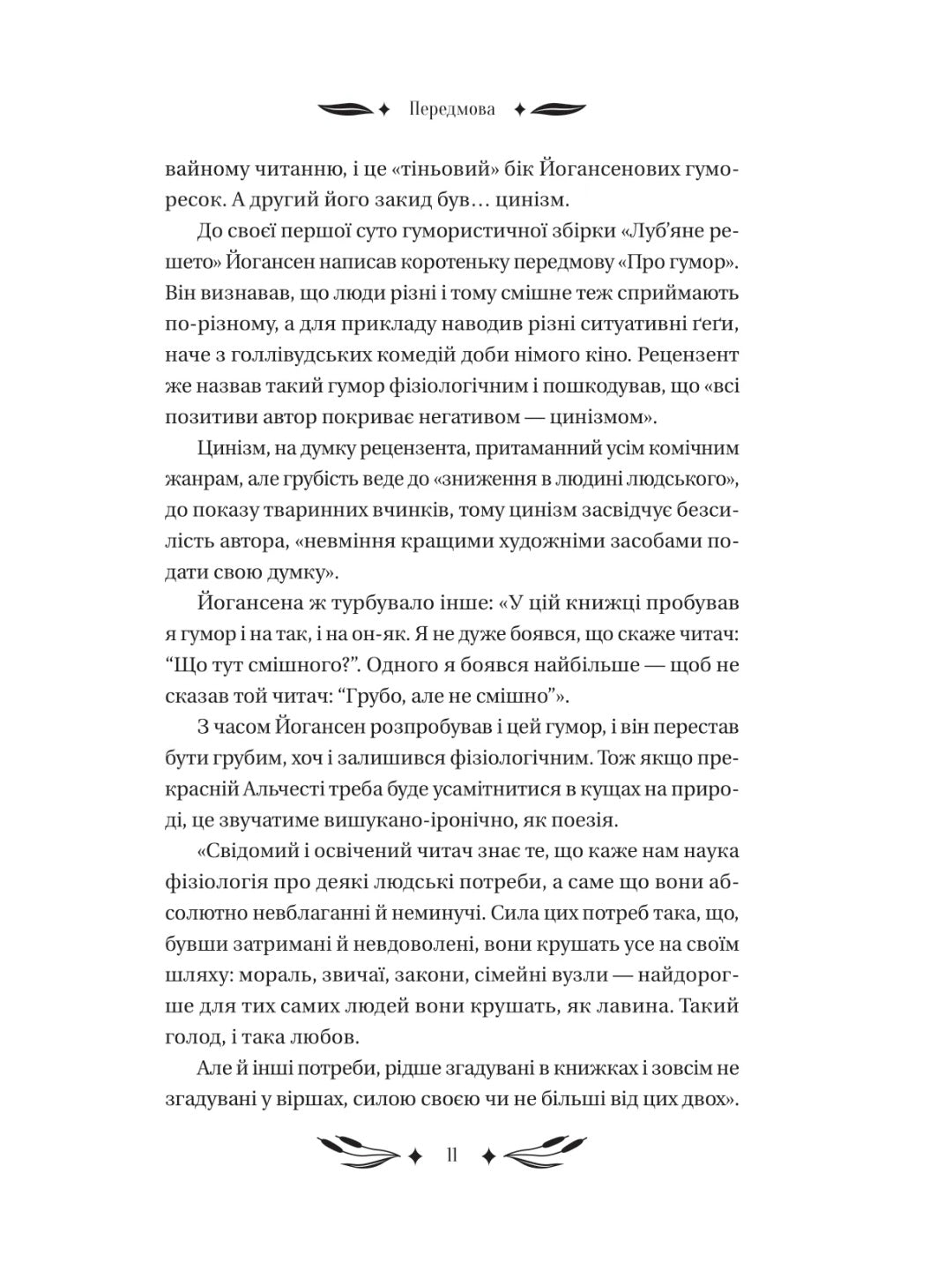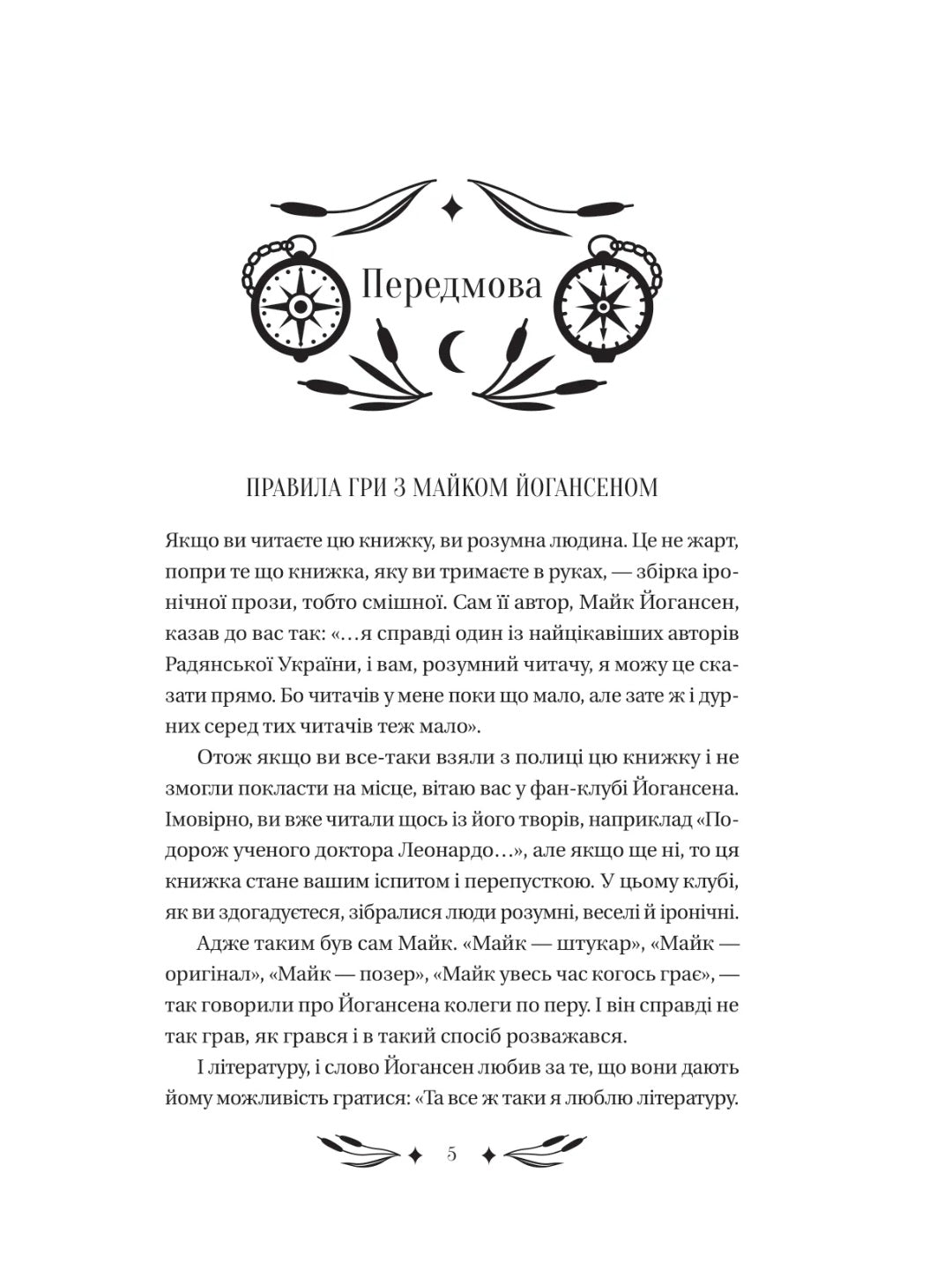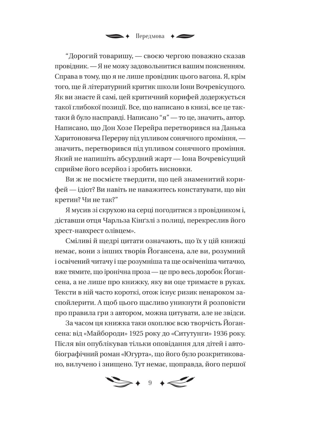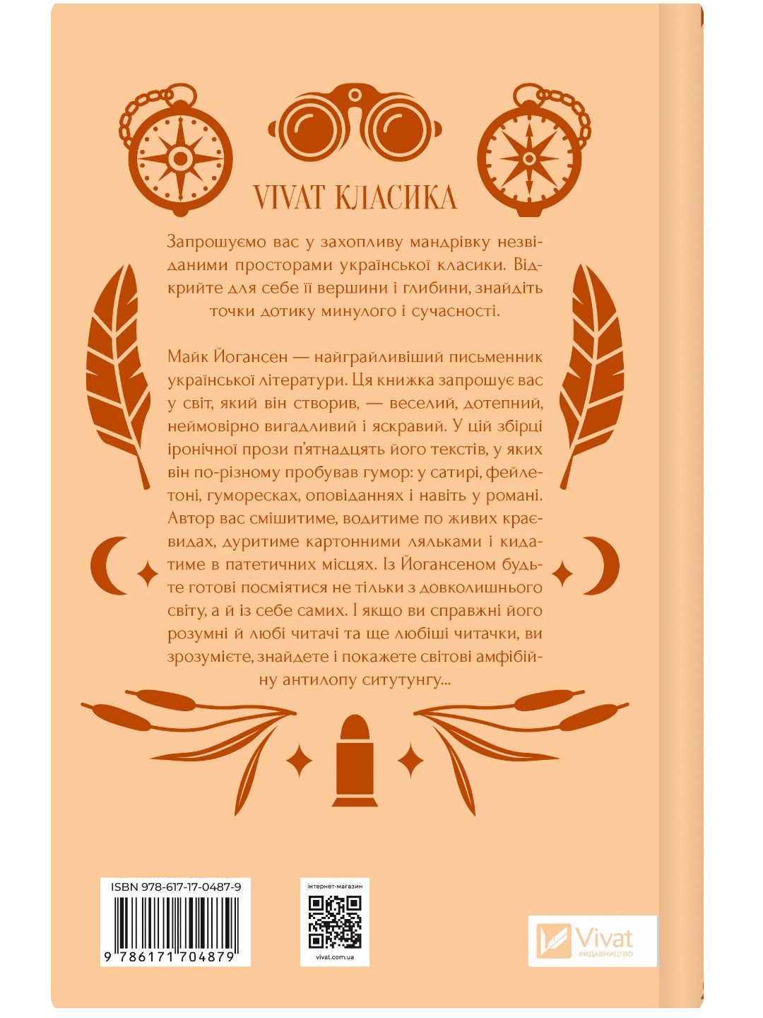 Майк Йогансен — найграйливіший письменник української літератури. Ця книжка запрошує вас у світ, який він створив, — веселий, дотепний, неймовірно вигадливий і яскравий. У цій збірці іронічної прози п’ятнадцять його текстів, у яких він по-різному пробував гумор: у сатирі, фейлетоні, гуморесках, оповіданнях і навіть у романі. Автор вас смішитиме, водитиме по живих краєвидах, дуритиме картонними ляльками і кидатиме в патетичних місцях. Із Йогансеном будьте готові посміятися не тільки з довколишнього світу, а й із себе самих. І якщо ви справжні його розумні й любі читачі та ще любіші читачки, ви зрозумієте, знайдете і покажете світові амфібійну антилопу ситутунгу...
