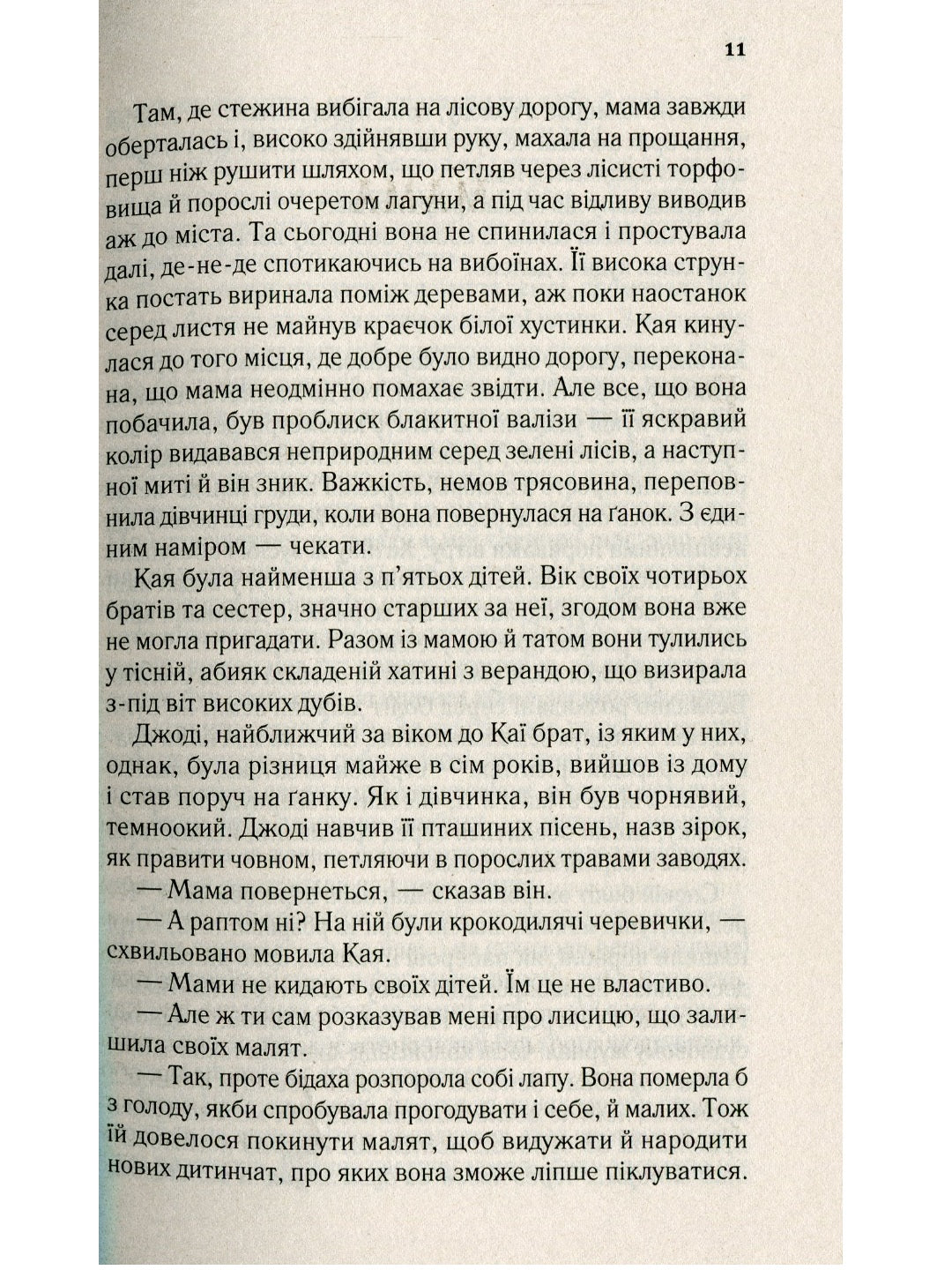 Коли Каї було шість років, мати покинула дітей і свого жорстокого чоловіка-алкоголіка, не попрощавшись і навіть не помахавши рукою. Брат обіцяв дівчинці, що мама повернеться, проте цього так і не сталося. Згодом і всі сестри й брати теж залишили родинний дім, і Кая лишилася сам на сам із батьком, ветераном війни, який постійно пропивав їхній невеликий заробіток і непередбачувано спалахував у приступах люті. Дівчина навчилася дбати про себе, ховатися від незнайомців і шкільних інспекторів, шукати їжу, готувати, орієнтуватися на болоті та жити з тим, що її покинули, сподіваючись, що мати повернеться. У своїй самотності Кая знайшла притулок серед болотяних істот, вивчаючи їхню мову та звички. Проте її спокій руйнується, коли одного разу на болоті виявляють тіло хлопця, і детектив починає підозрювати, що Кая якось пов’язана з цією справою.