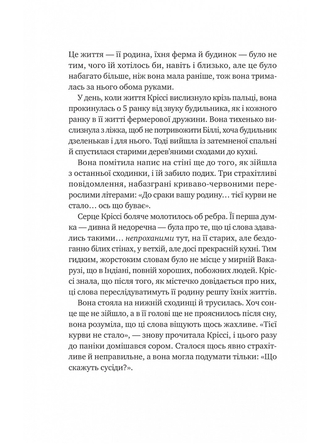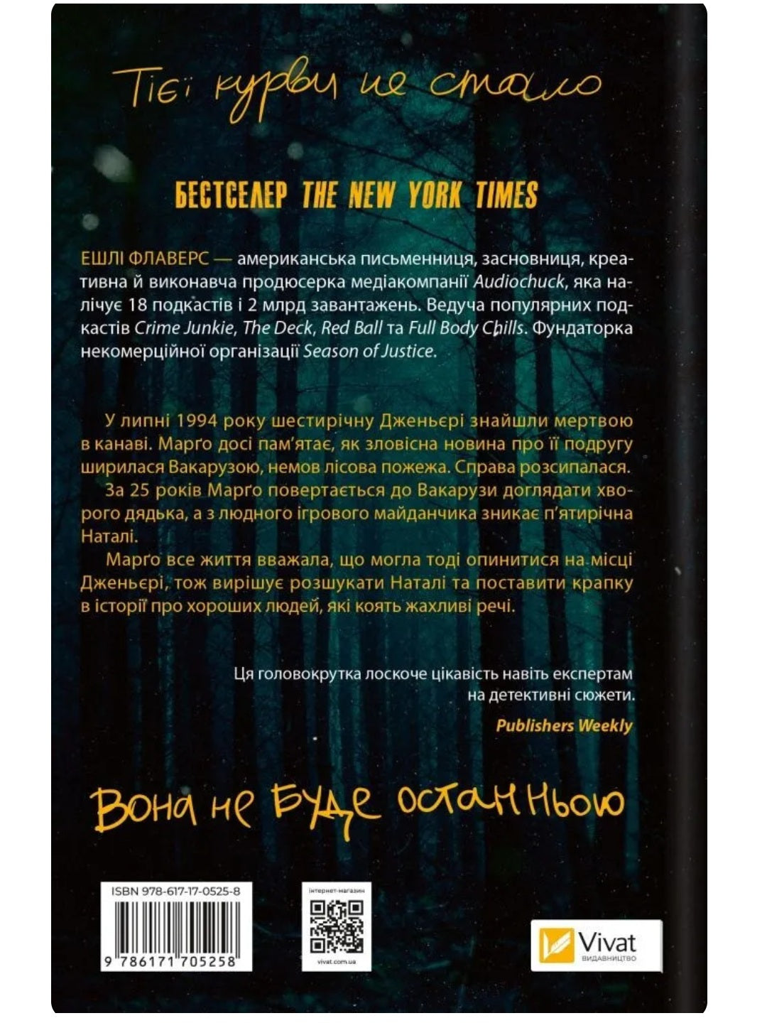 Це сталося знову... Марґо все життя вважала, що могла тоді опинитися на місці Дженьєрі, тож вирішує розшукати Наталі та поставити крапку в цій історії. Та що більше подробиць з’ясовує журналістка, що більше незручних питань озвучує, то сильніший опір їй чинять містяни. Невже вони не хочуть, щоб злочини були викриті? І чи справді викрадач Наталі й убивця Дженьєрі — одна й та ж людина?