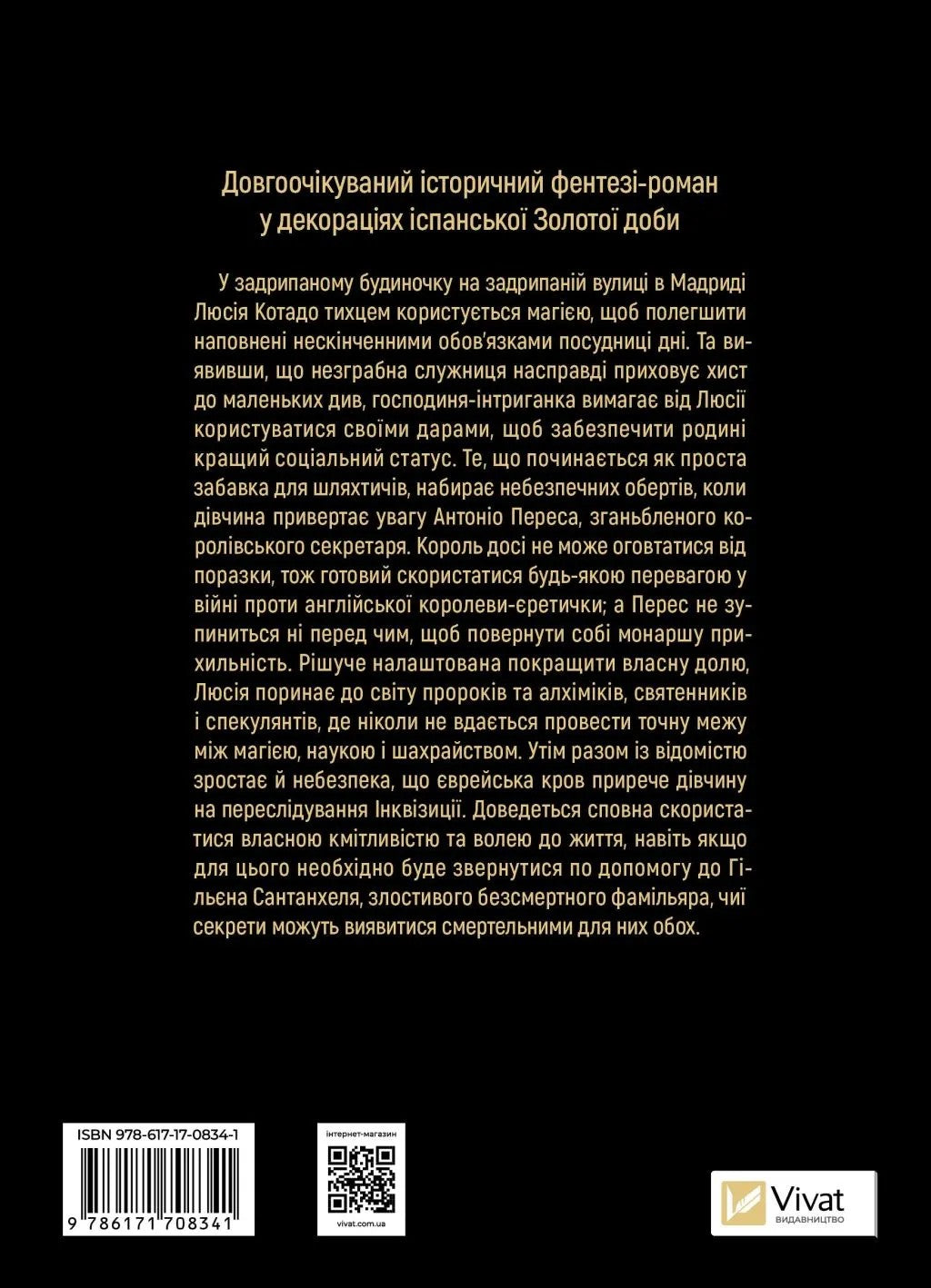 Рішуче налаштована покращити власну долю, Люсія поринає до світу пророків та алхіміків, святенників і спекулянтів, де ніколи не вдається провести точну межу між магією, наукою і шахрайством. Утім разом із відомістю зростає й небезпека, що єврейська кров прирече дівчину на переслідування Інквізиції. Доведеться сповна скористатися власною кмітливістю та волею до життя, навіть якщо для цього необхідно буде звернутися по допомогу до Гільєна Сантанхеля, злостивого безсмертного фамільяра, чиї секрети можуть виявитися смертельними для них обох.