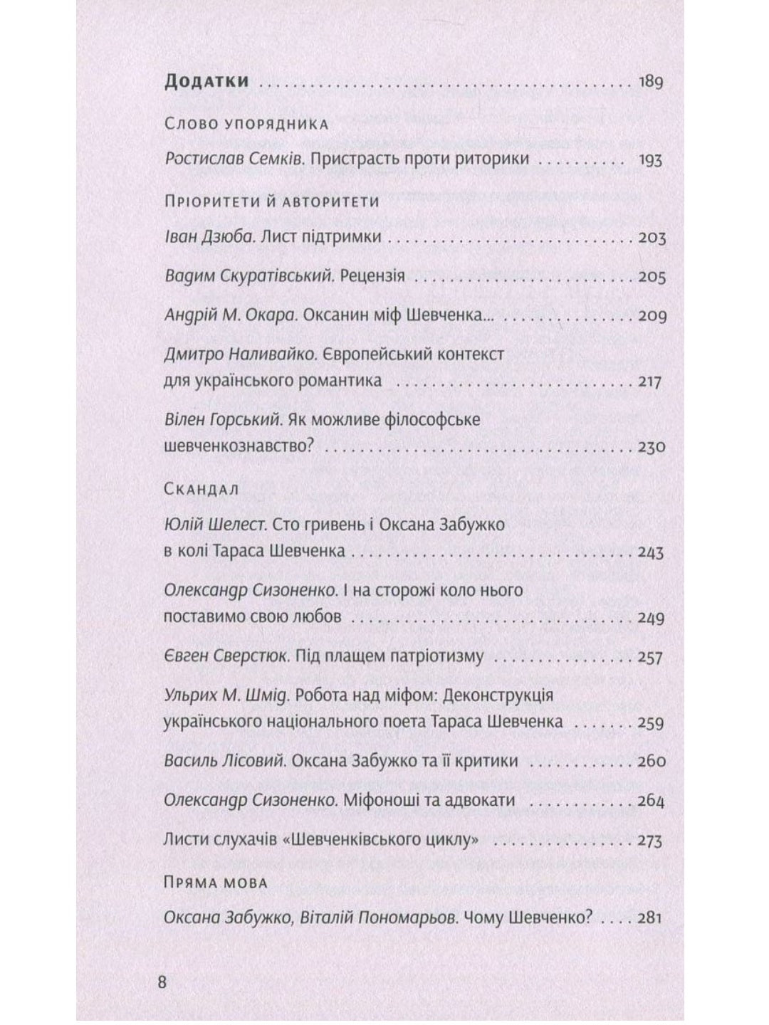 Книга "Шевченків міф України. Спроба філософського аналізу" вперше вийшла друком 1997 року і справила ефект бомби в українському літературознавстві - не менший, ніж "Польові дослідження з українського сексу" в літературі. Авторський метод інтерпретації класичних текстів скандалізував адептів канону Великого Кобзаря, і дискусія швидко переросла в "битву за святині". Тепер, із відстані у двадцять років, пропонуємо читачеві поглянути на цю унікальну працю в контексті - додана добірка літературної критики та публіцистики відображає полеміку, що вирувала після першої публікації книги.