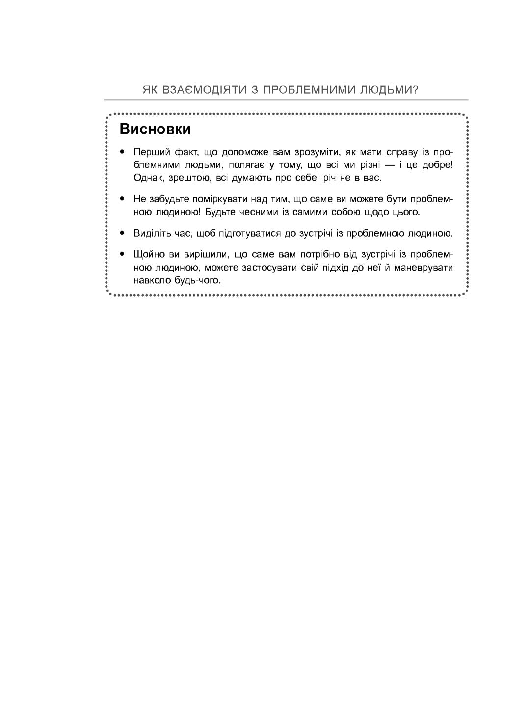 Розуміючи мотиви та поведінку проблемних людей, ви зможете приборкати свою агресію, перемогти ніяковість і лишитись кращою особистістю. Практичні вправи, корисні моделі й цінні поради дозволять вийти переможцем із найгіршої ситуації, навчать давати раду складним покупцям, проблемним людям у царині інформаційних технологій, допоможуть поставити на місце кривдника і дати відсіч босу.