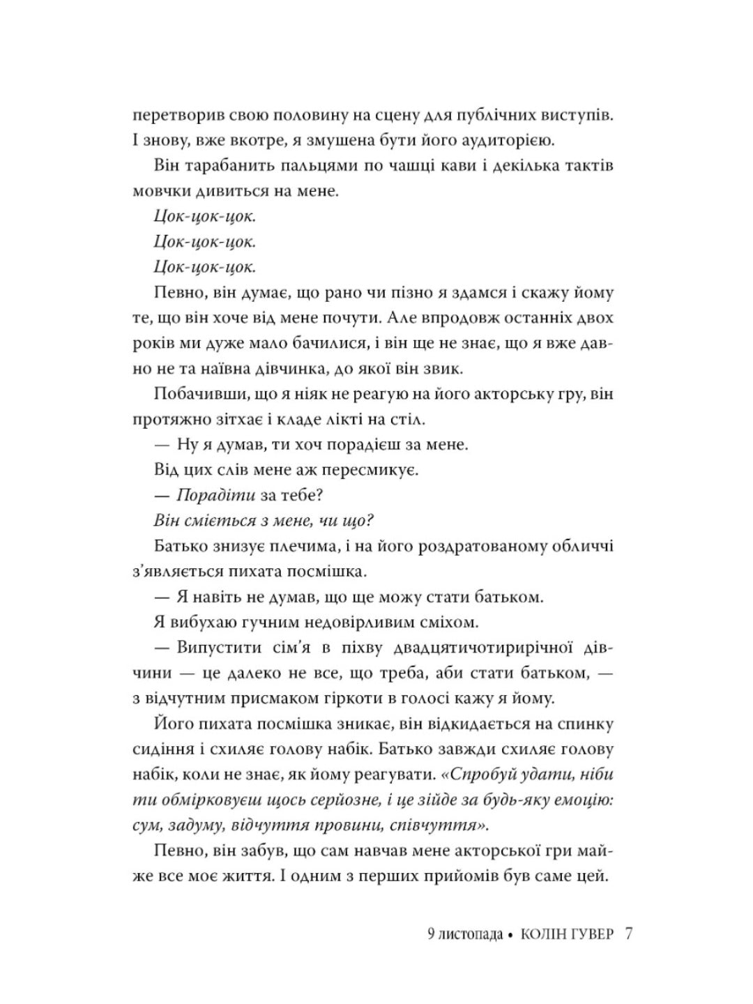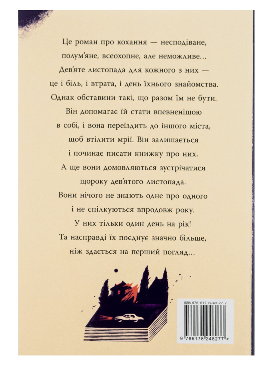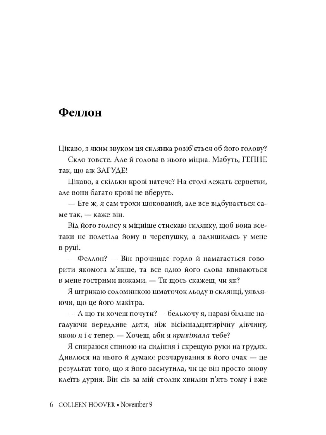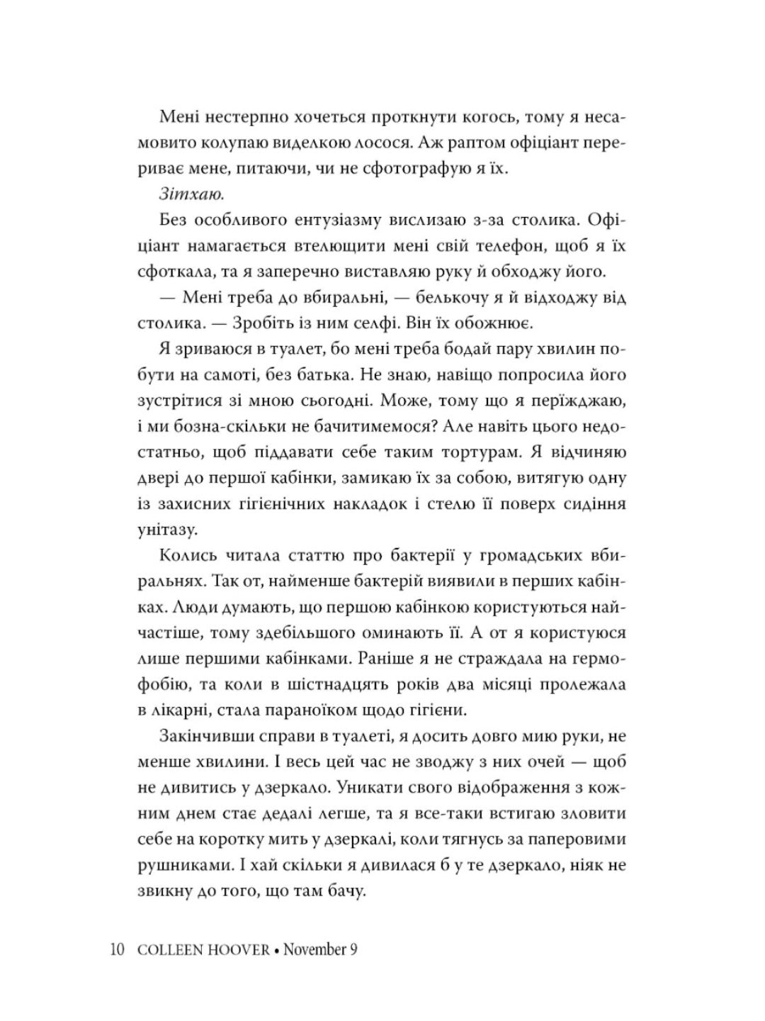 Цього разу письменниця звертається до теми краси — внутрішньої та зовнішньої. Через шрами Феллон тепер не вважає себе привабливою. Проте Бен бачить в ній більше ніж тільки дівчину зі травмами. Він допомагає їй подивитися на себе його очима і повернути впевненість. Своєю чергою, спілкування з Феллон допомагає хлопцю в його боротьбі з депресією та творчою кризою. Тож це книга про зцілення й важливість підтримки на цьому шляху, сміливість у досягненні мрій і, звісно, драматичне й чуттєве кохання. Варто звернути увагу на «9 листопада», якщо ви любите історії, які вибухають емоціями, дивують карколомними моментами та зворушують почуттями персонажів.