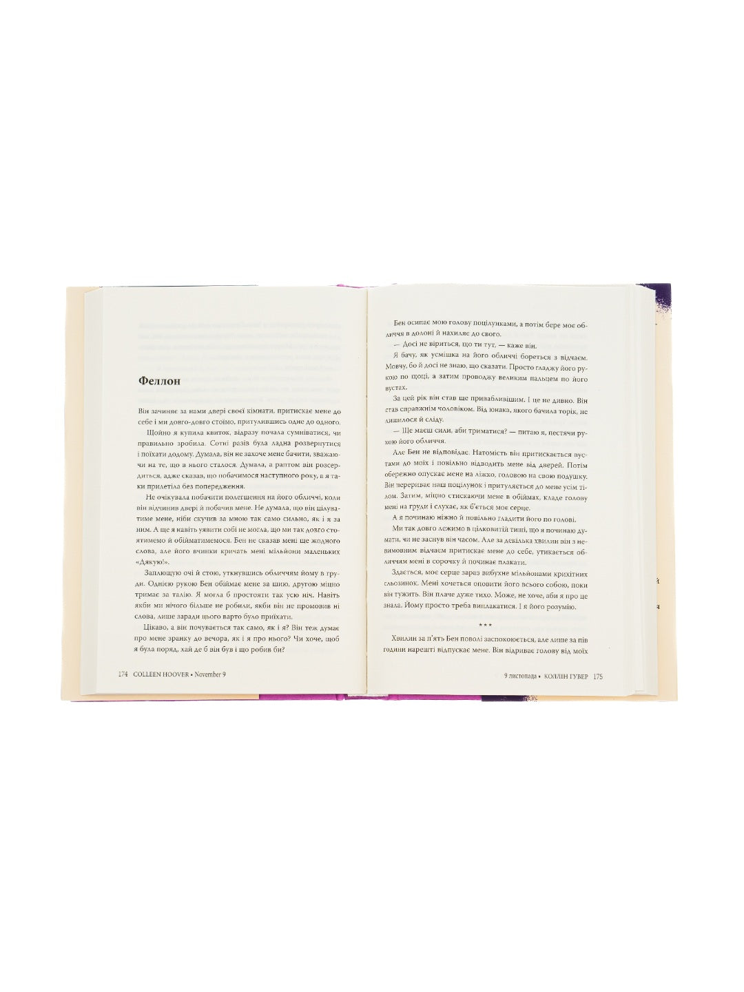 Коллін Гувер, авторка бестселерів, серед яких «Покинь, якщо кохаєш», «Огидне кохання», «Веріті» — майстриня сучасних любовних романів, які зворушують читачів до сліз. «9 листопада» не є винятком ні в емоційності, ні в популярності. Оповідь у книзі почергово ведеться від Бена та Феллон, що теж є визначальною рисою стилю авторки. Персонажі мають свої недоліки, місцями кумедні та дотепні, що робить їх живими. Історія дуже кінематографічна, адже читання відчувається наче перегляд фільму. Як і головні герої, ми нічого не знаємо про їхнє життя між зустрічами.